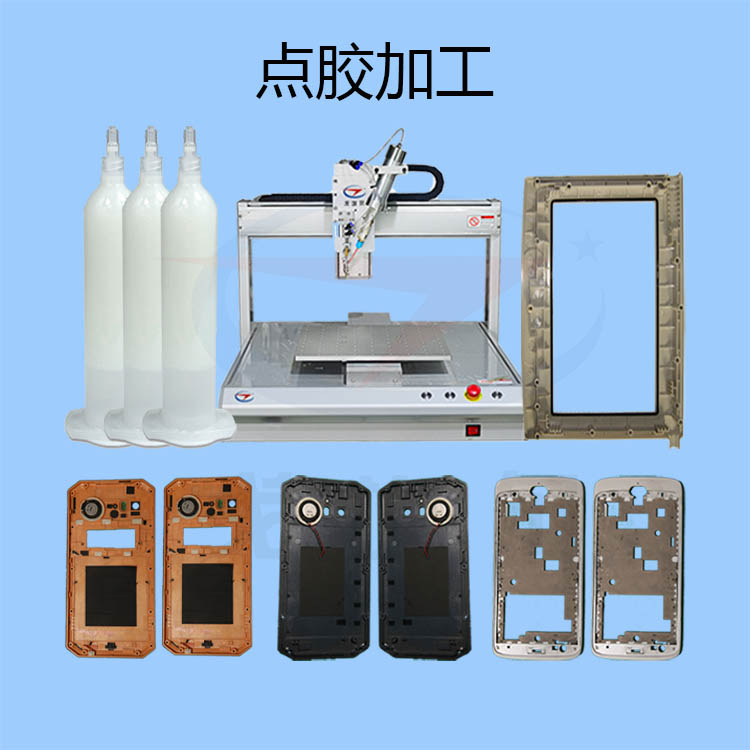 熱壓結構膠點膠加工是依序對工件進行點膠、熱壓合,然后靜置工件,待使用于壓合的膠體冷卻凝固。熱壓結構膠點膠加工所采用的熱壓結構膠是一種固化或干燥后具有一定性能的一種膠黏劑,它通常以基體樹脂和其他填料組成,通過基體樹脂的粘接作用把其他輔助填料結合在一起,形成性能優良的膠體,實現被粘材料的良好的連接。