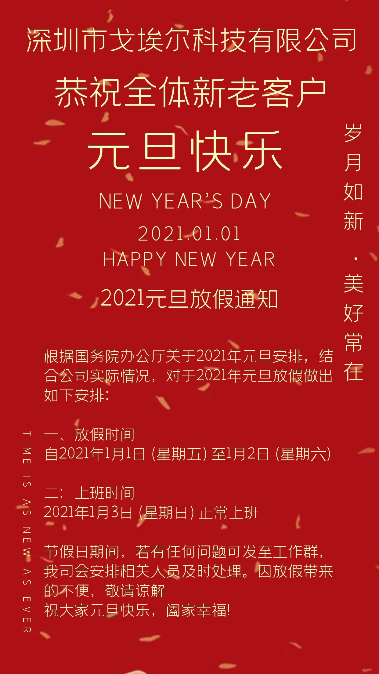 在此,深圳市戈埃爾科技有限公司全體同仁預祝大家在新的一年里:祝大家身體健康,闔家歡樂,祝您事業萬事順意,牛氣沖天!